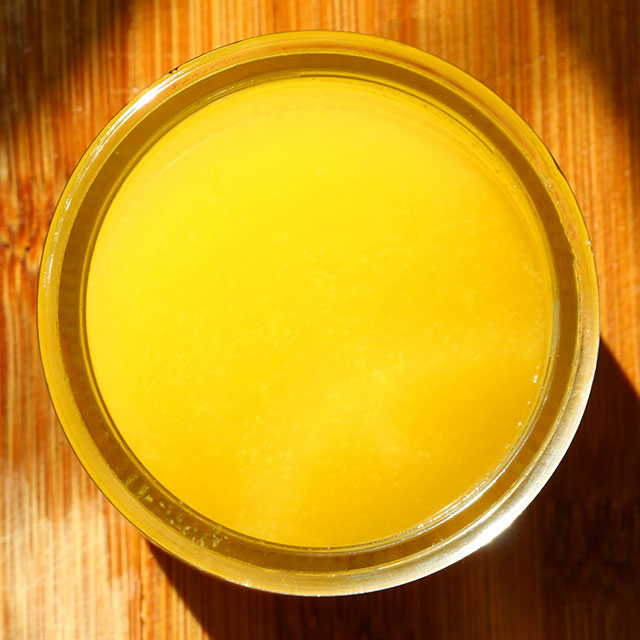 Ghee is prepared by simmering butter, which is churned from cream, and removing the liquid residue. The texture, colour, and taste of ghee depends on the quality of the butter, source of the milk used in the process and the duration of the boiling.